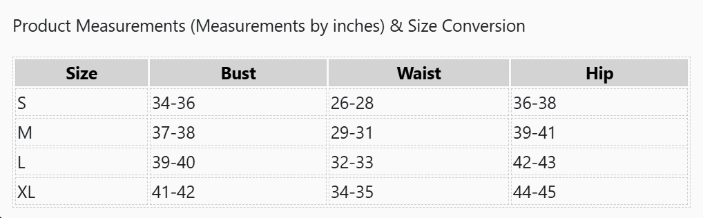 Product Measurements (Measurements by inches) & Size Conversion